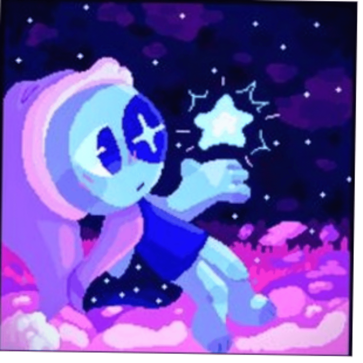 Astro is a light blue crescent waning moon. The left side of his face is black with a white star eye. He wears a cornflower blanket wrapped around his torso, obscuring his arms to the point where they are barely visible as faint furrows in the blanket.