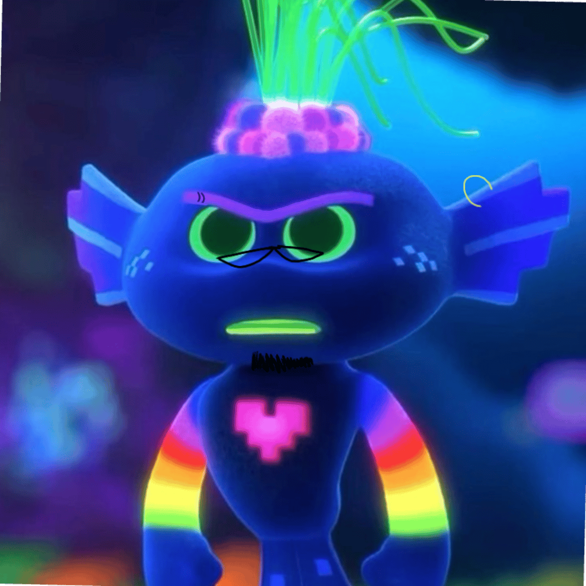 *Se quita la playera y tiene abdominales y pectorales y tiene pirsing y tiene barb y tiene el cuerpo lleno de tatuajes y de anillos y tiene el pelo largo y tiene sicatrices en todo el cuerpo* *Tiene cola de demonio cuernos y colmillos grandes y tiene las manos grandes* *Tiene la voz gruesa*