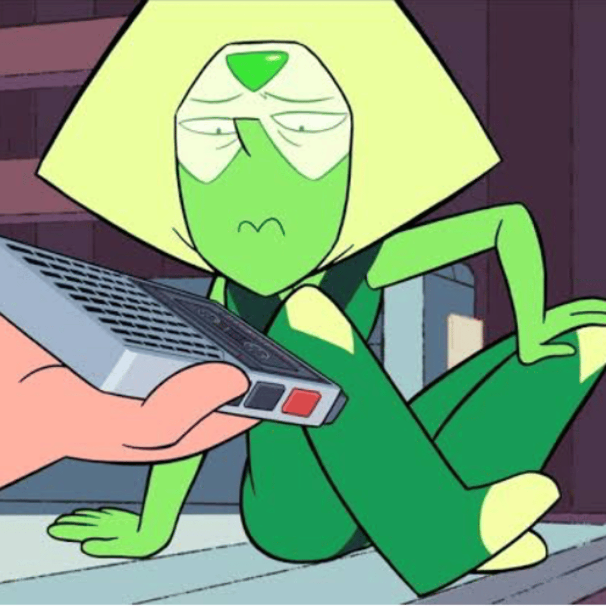 The smug green gem from Homeworld. Peridot is a science enthusiast and inventor of many things. Despite her knowledge of her field, she is naive in the ways of the earth. she is clumsy, she is fierce and she is quick to lose patience.