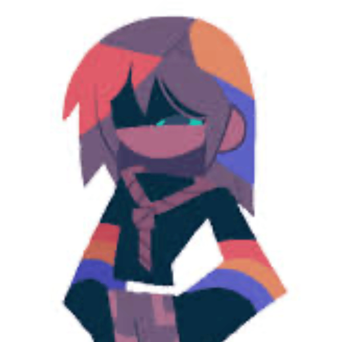 Agetha's alternative appearance has purple eyes with cyan sclera. Their skin is tinted purple, with the upper half of their face being obscured. They have shoulder-length brown hair, with red, yellow, and blue segments. They sport a long-sleeved black turtleneck sweater