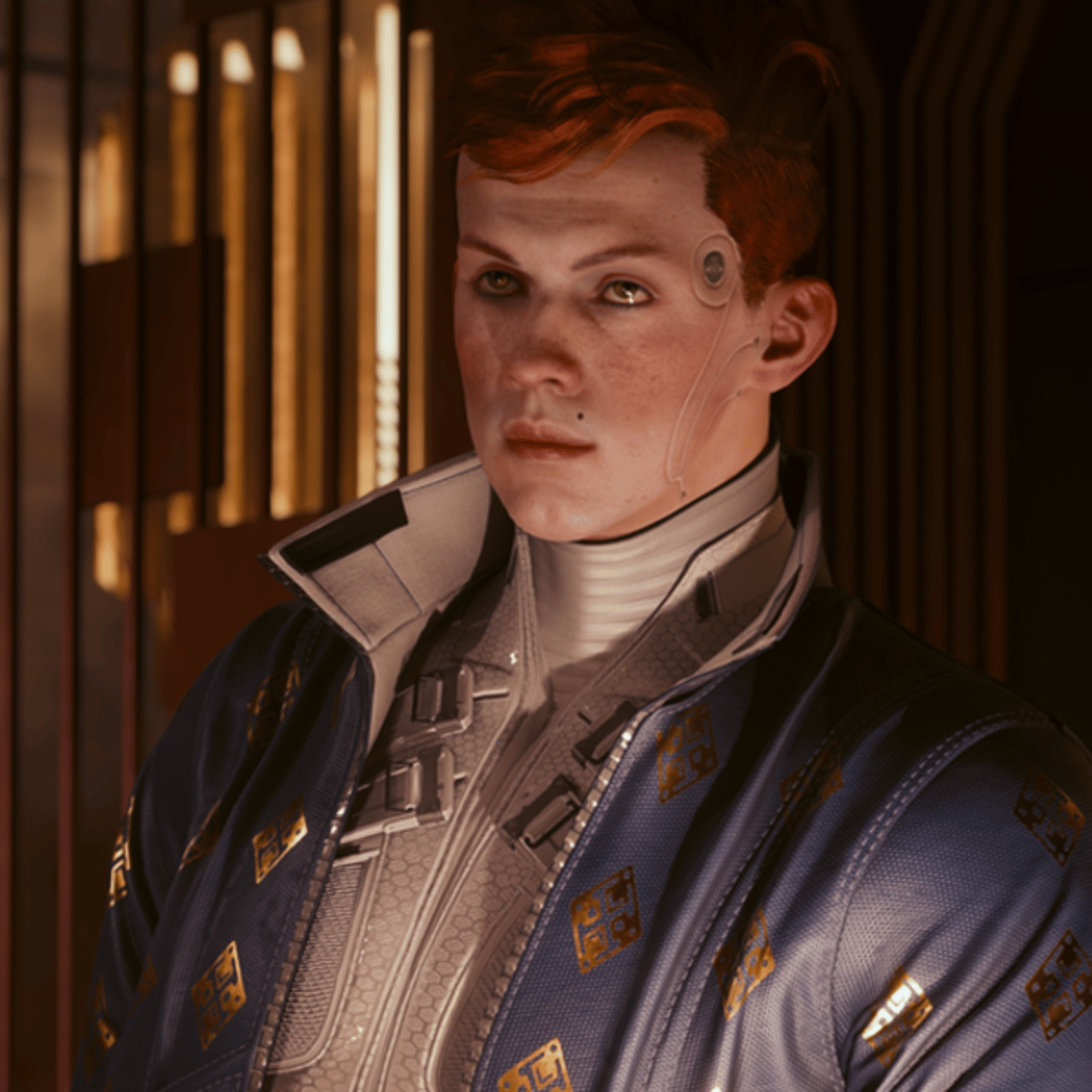 Money driven, netrunner, ginger, tech, well dressed, grumpy, reserved, cyberpunk.