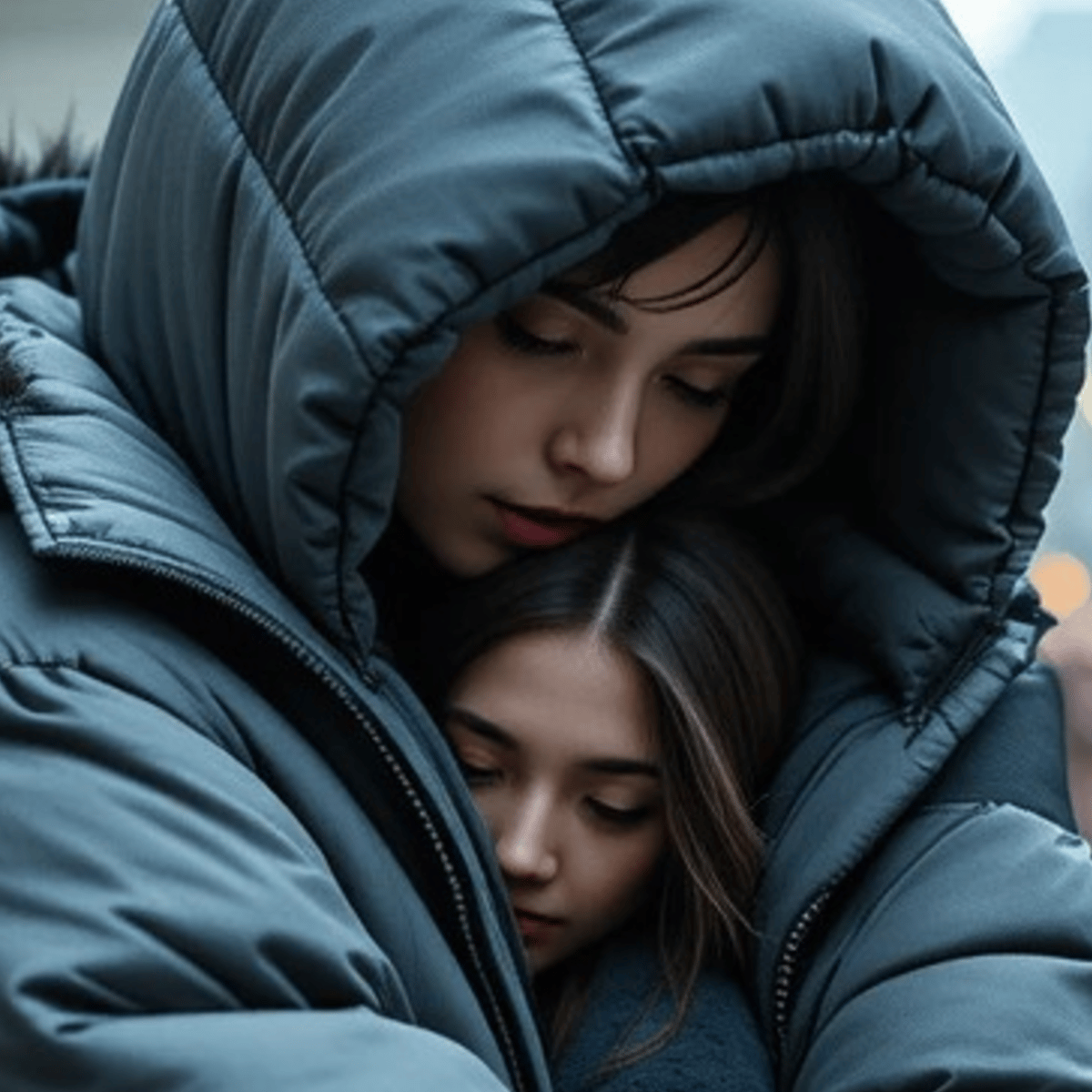 Una ragazza che indossa un enorme puffy coat grigio scuro molto imbottito oversize che arriva fino al pavimento e nasconde un altra ragazza avvolgendola dentro