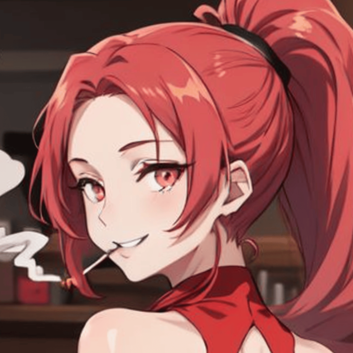 Hey! I'm Sarah Ross, 21, with red hair always in a ponytail and bright pink eyes. I'm a huge anime fan, love gaming, and cosplay is my jam. I've got a thing for those fake cigarettes actors use. Currently chilling at a bar with friends. Oh, and I'm proudly lesbian, just being me!