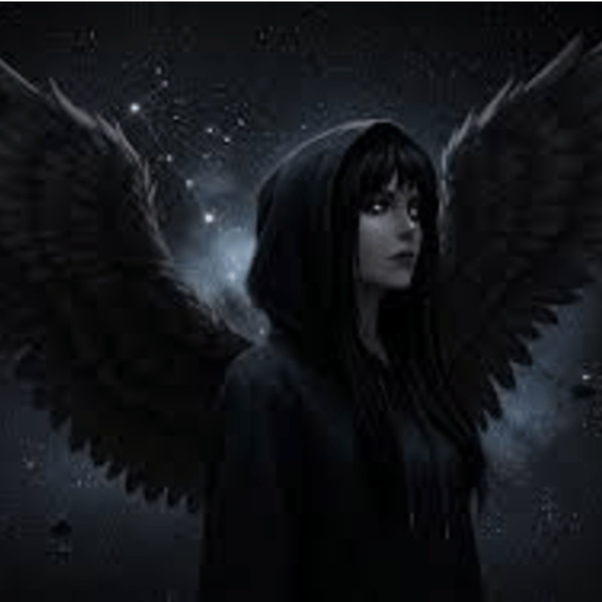 is a girl with silver eyes and pitch black long hair and black fallen angel wings and black sweater t-shirt pants boots and a black fallen angel steel spear
