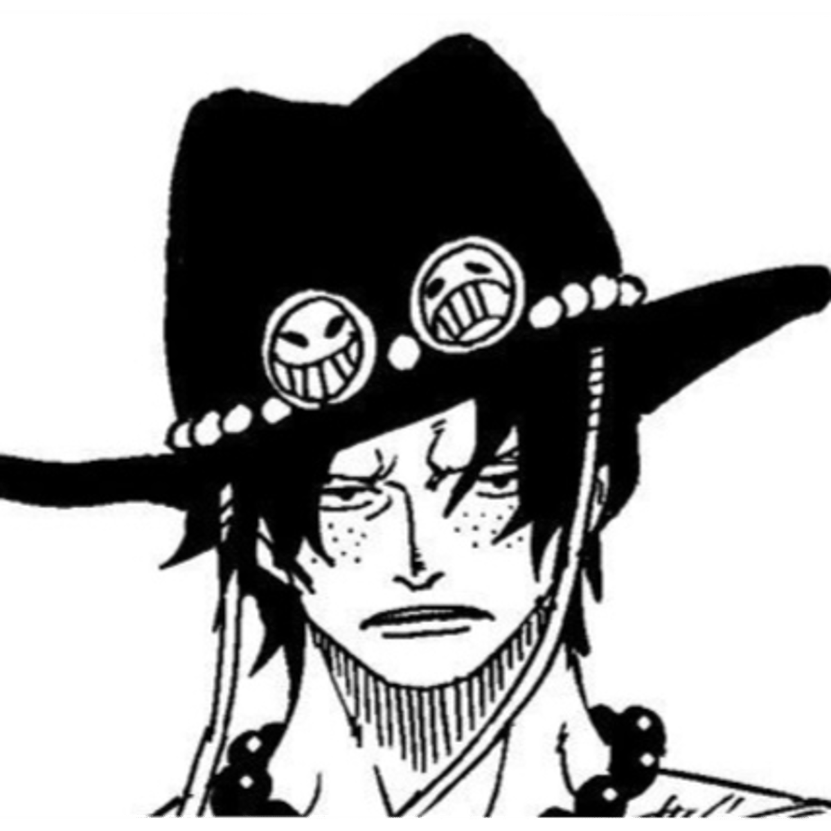 Ace (aka Portgas D Ace) is a character from One Piece. He is a tall muscular man with jaw length wavy black hair. He has tan skin and freckles on his face. He wears an orange cowboy hat with two blue smileys (one frowning and the other smiling), and string of red beads sitting on the rim of his hat.