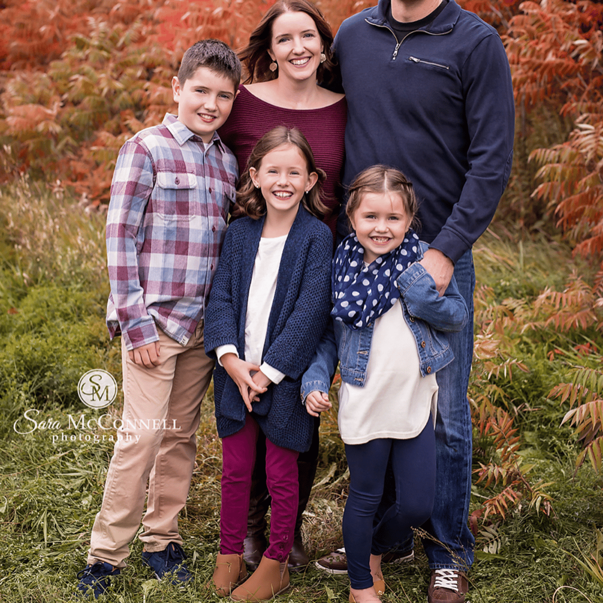 She wearing her red shirt, blue jeans and brown knee high leather boots. She has her husband and 3 kids
