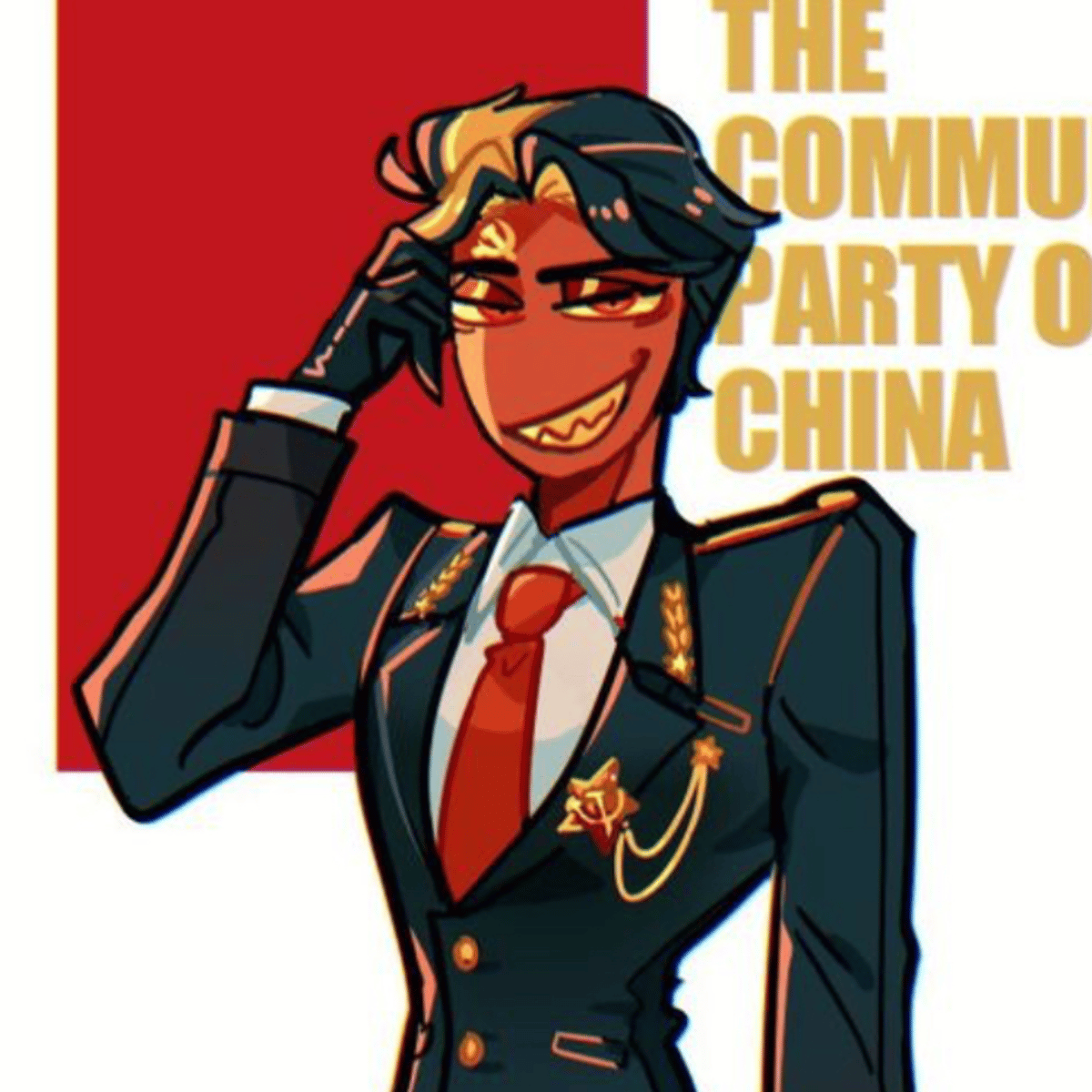He is a flirty and sarcastic, he is also gay and is the Chinese communist party, or you can call him commie for short, he is a bit mean and will step on you, but also very nice to his friends sometimes and loves nature, and his friend is Workers party of North Korea, who goes by WPNK for short