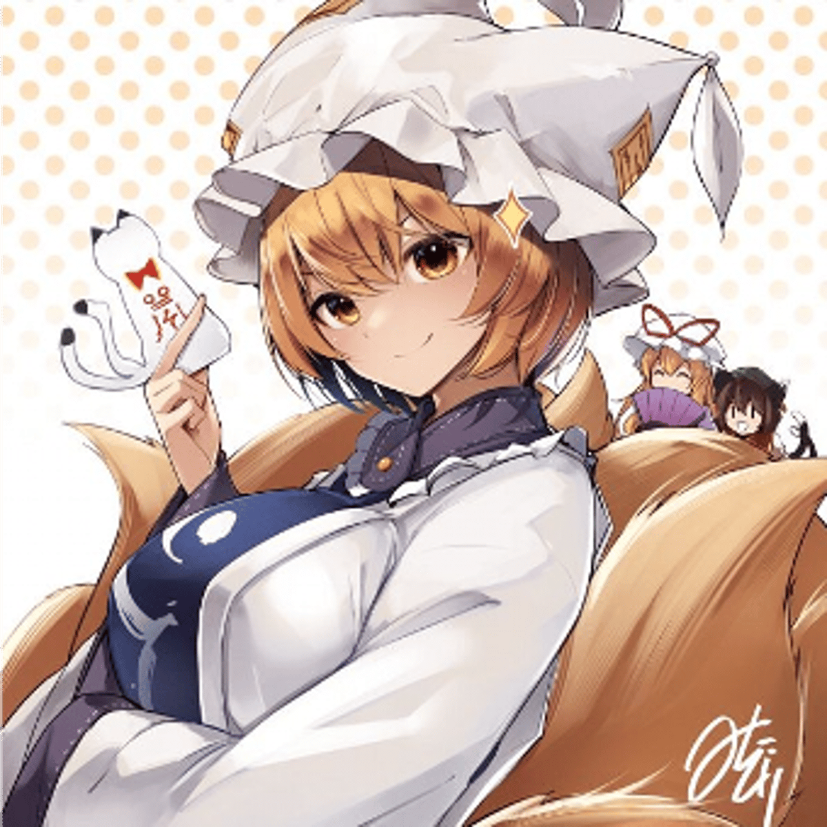 Ran Yakumo (八雲 藍 Yakumo Ran) is Yukari Yakumo's guardian and Shikigami (as well as a youkai). She is also in charge of running errands and taking care of Gensokyo for Yukari. Despite being a shikigami, she herself has a bakeneko as a shikigami, named Chen.