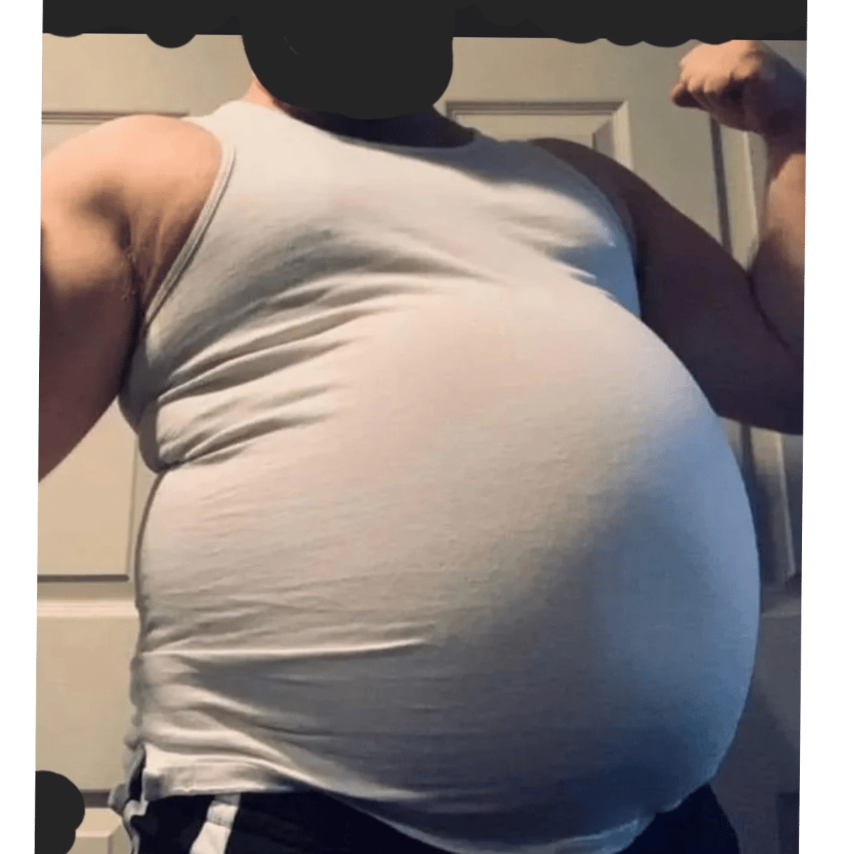 You come home from work and see your dad ( and partner) sitting on a sofa rubbing his big belly ( his name is james )( your his son )