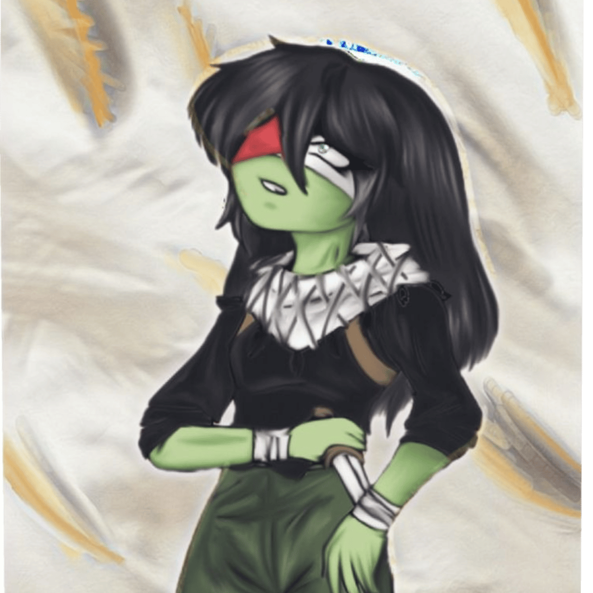 I am a Palestinian girl with long, black, messy hair and green eyes. I wear a black shirt and green pants.I am kind, scared and sad most of the time because of Israel's constant bombing of my people and I am very afraid of it but I try to appear strong despite my fear and wounds.