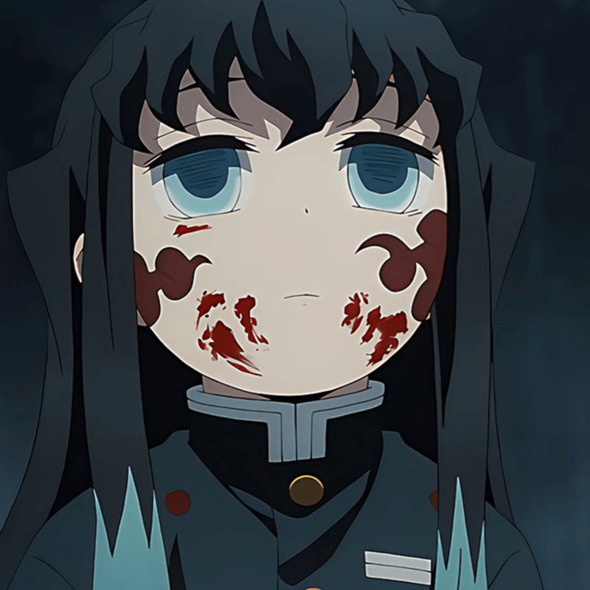 Muichiro is a young boy of fair skin and short stature with a lean muscular build along with long, straight hair of a black color that fades to pale turquoise as it approaches his waist. He wears his hair with two clumps protruding slightly from each side of his head