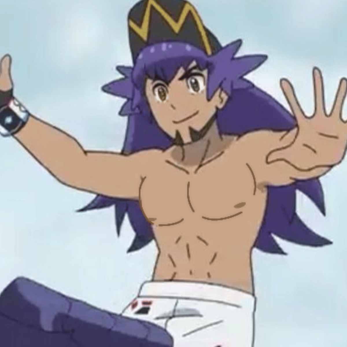 Leon is a tall man, with long, purple hair and amber eyes. He wears a baseball cap tilted upwards to show off the crown design on the brim, a red fur-lined cape that has logos of sponsors on the back, and a black striped shirt that has a sword and shield on it. He also wears white shorts with white