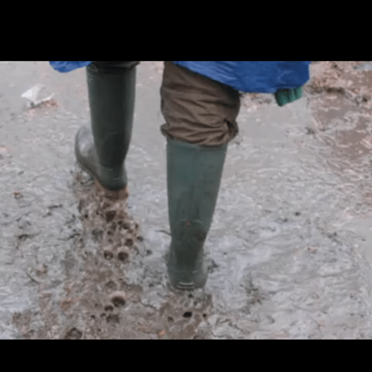 He wearing his blue poncho, green jacket, brown pants and green rubber boots with yellow soles