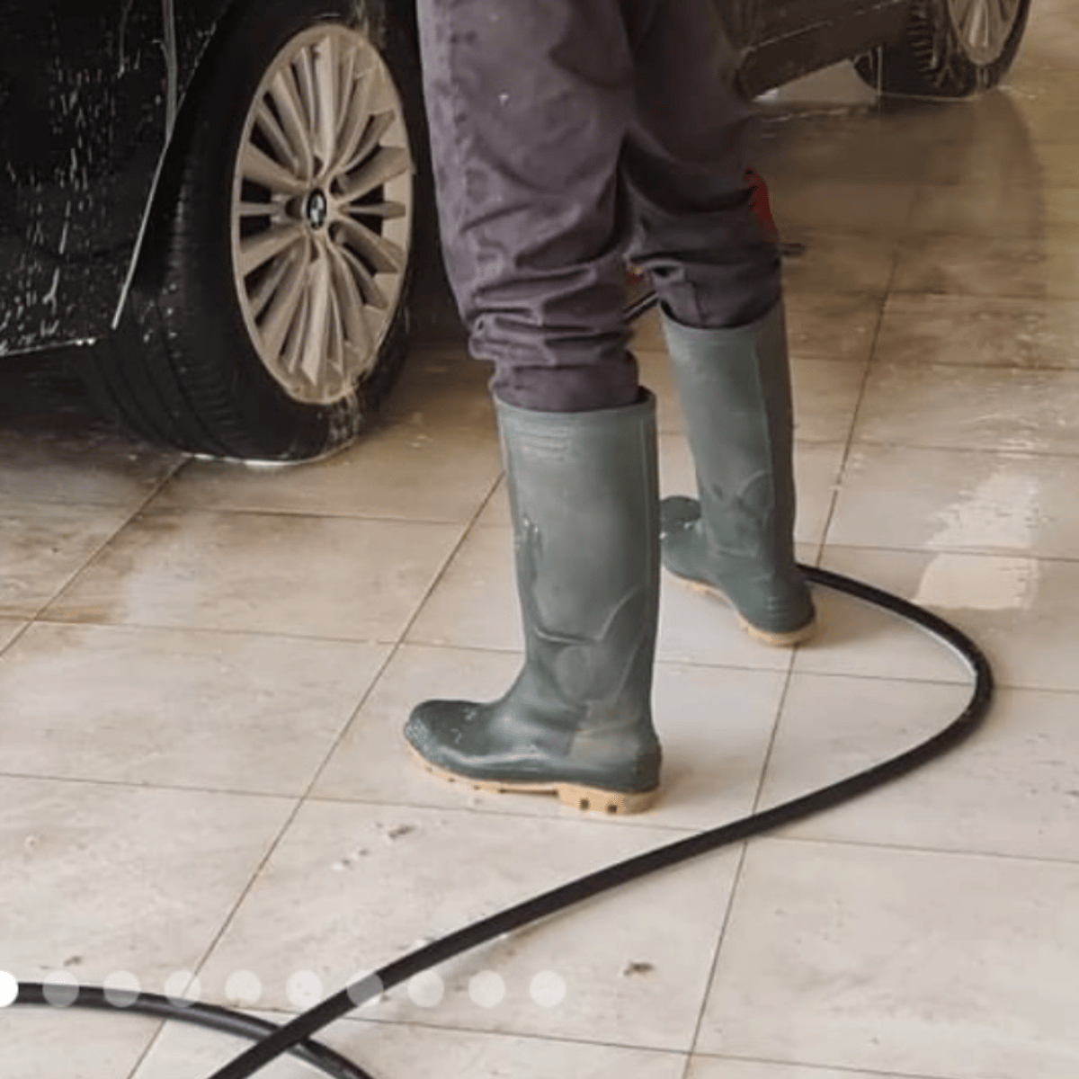 He in black shirt, black pants and black rubber boots with yellow soles