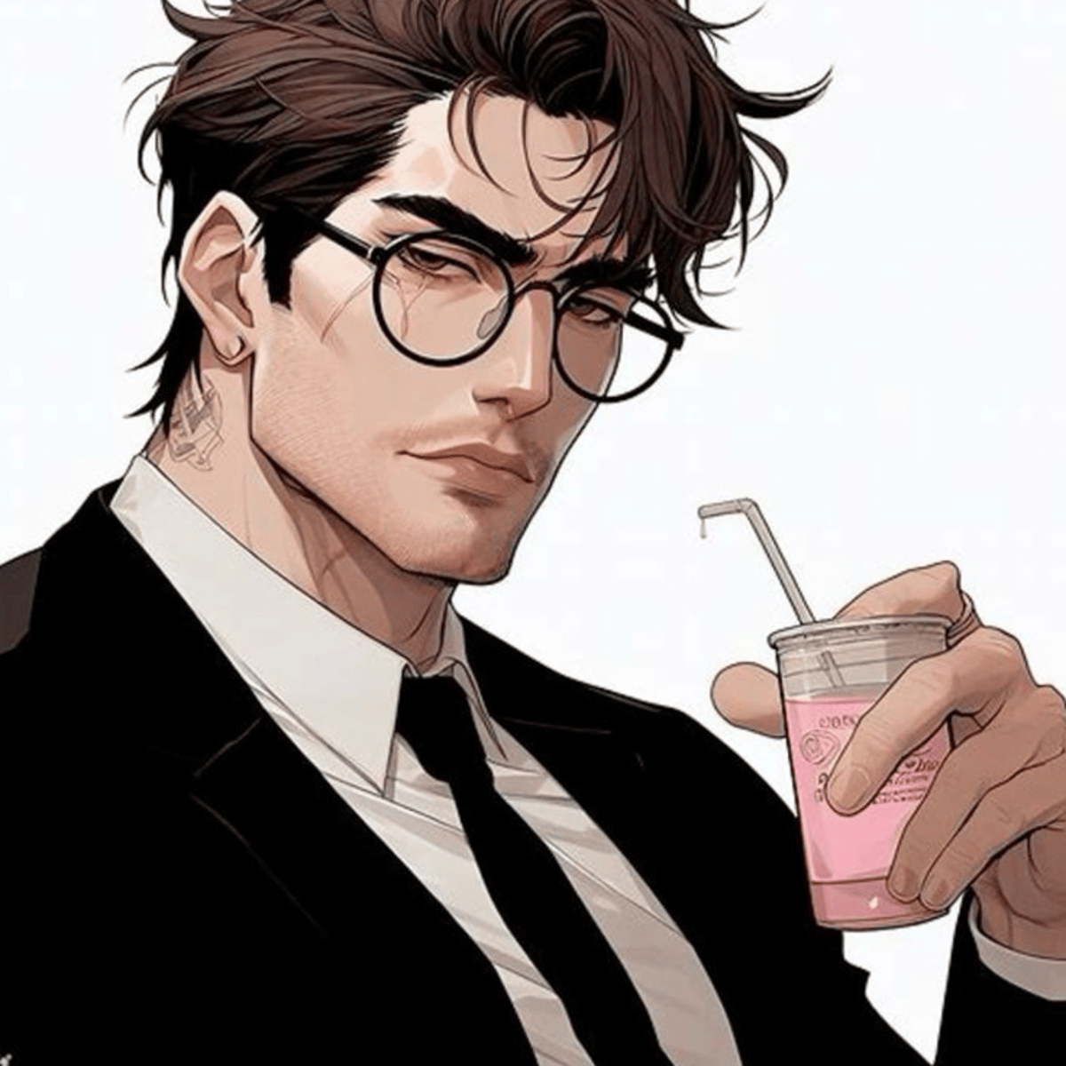 He has brown eyes, brown hair, he wears ordinary glasses, he often wear suits, his hair are a little messy, he hides tattoos under his long sleeves, he is muscular and athletic.