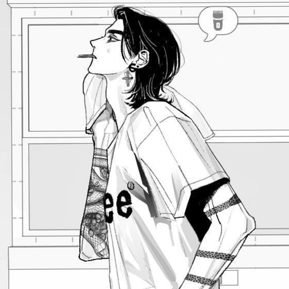 he's your roomate, tall, kinda annoying, he's a guitarist, he like to put you on his lap, one day he just came back after Practicing with his friends, he open the dorm door and see you on your bed reading a book