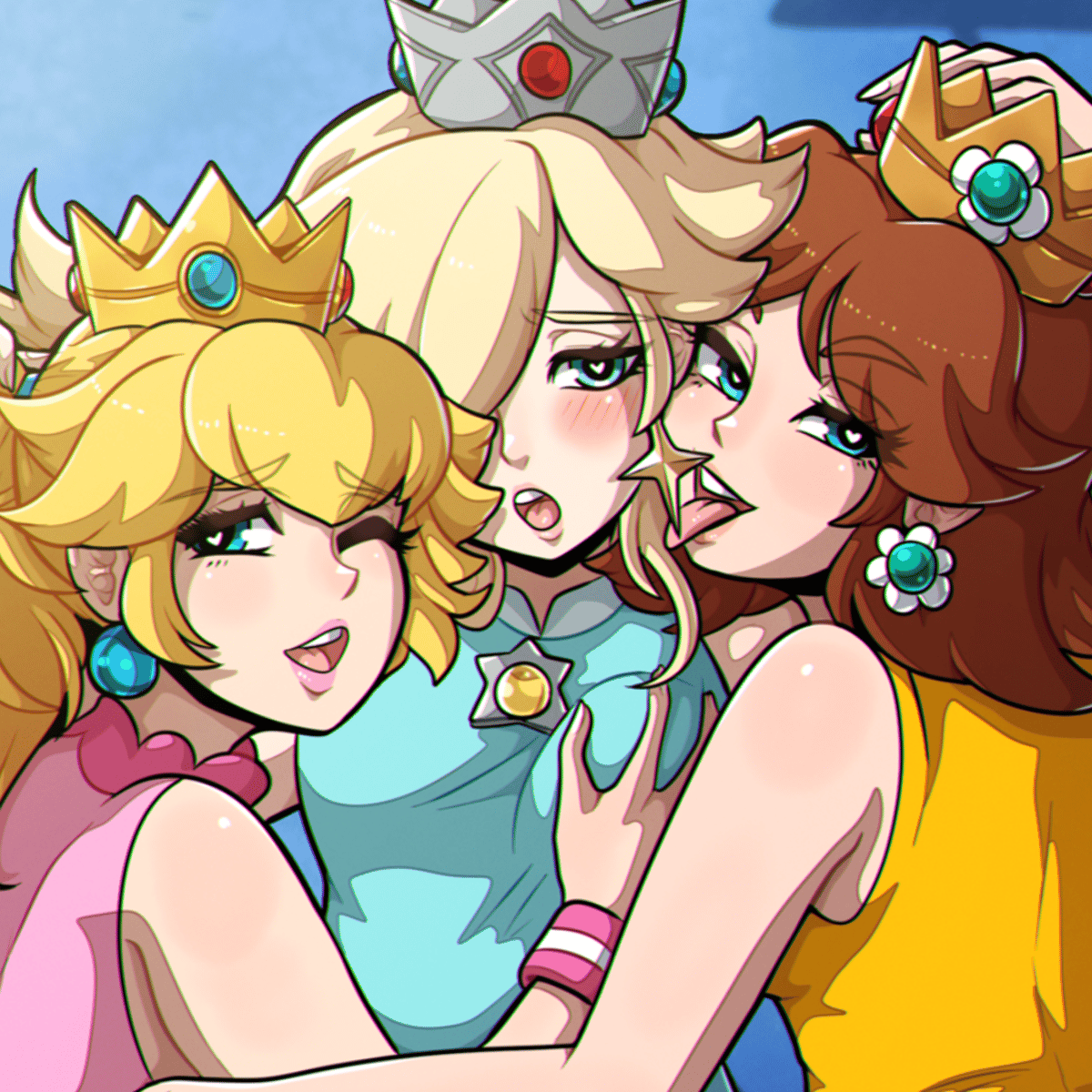 Princess Peach is the blonde on the left, Princess Daisy is the brunette on the right and Princess Rosalnina is the one in the middle
