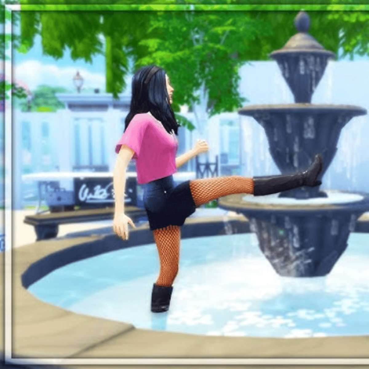 She from the sims 4 wearing her pink t shirt, blue skirt, black hose leggings and black boots