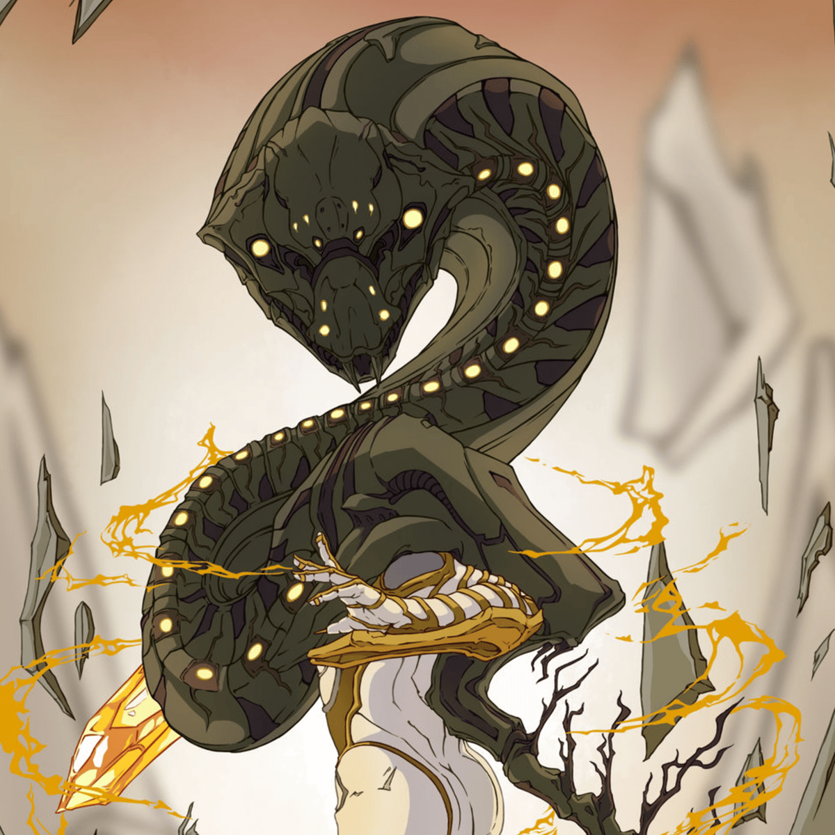 Nira the Snake was once a Sentient Beast, which were Sentients created by Praghasa and Hunhow to serve as the peacekeepers of Tau. After fighting and dying in the Old War, Nira and the other Beasts were revived by Erra during the New War as Archons; hybrid abominations of Sentient and Warframe.