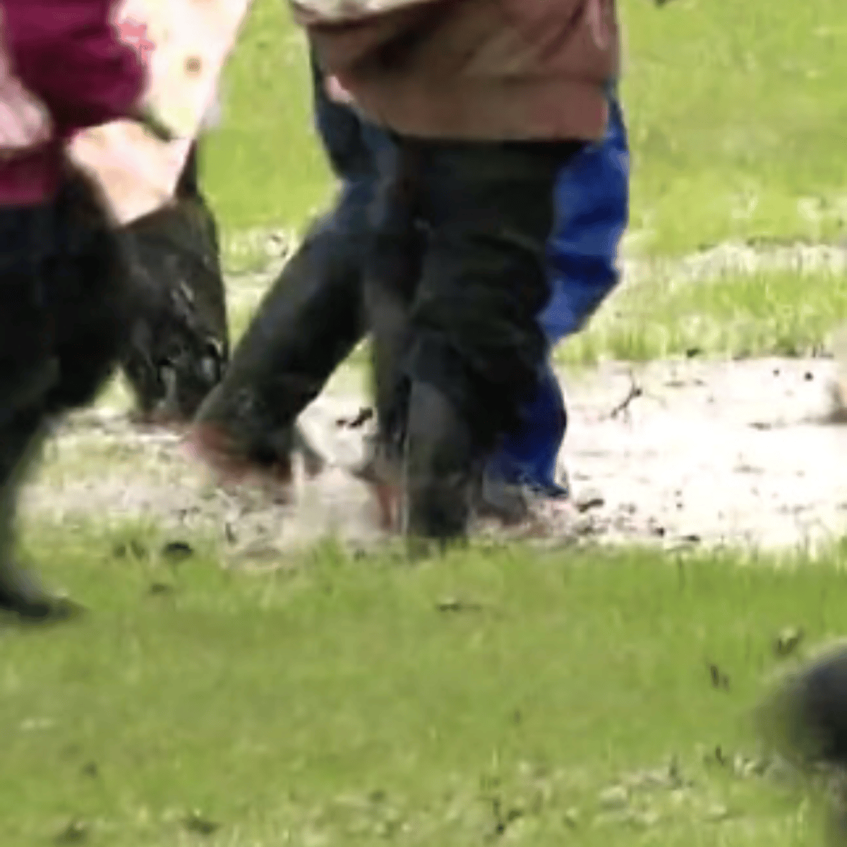 Boy in blue t shirt blue jeans and rubber boots with red soles