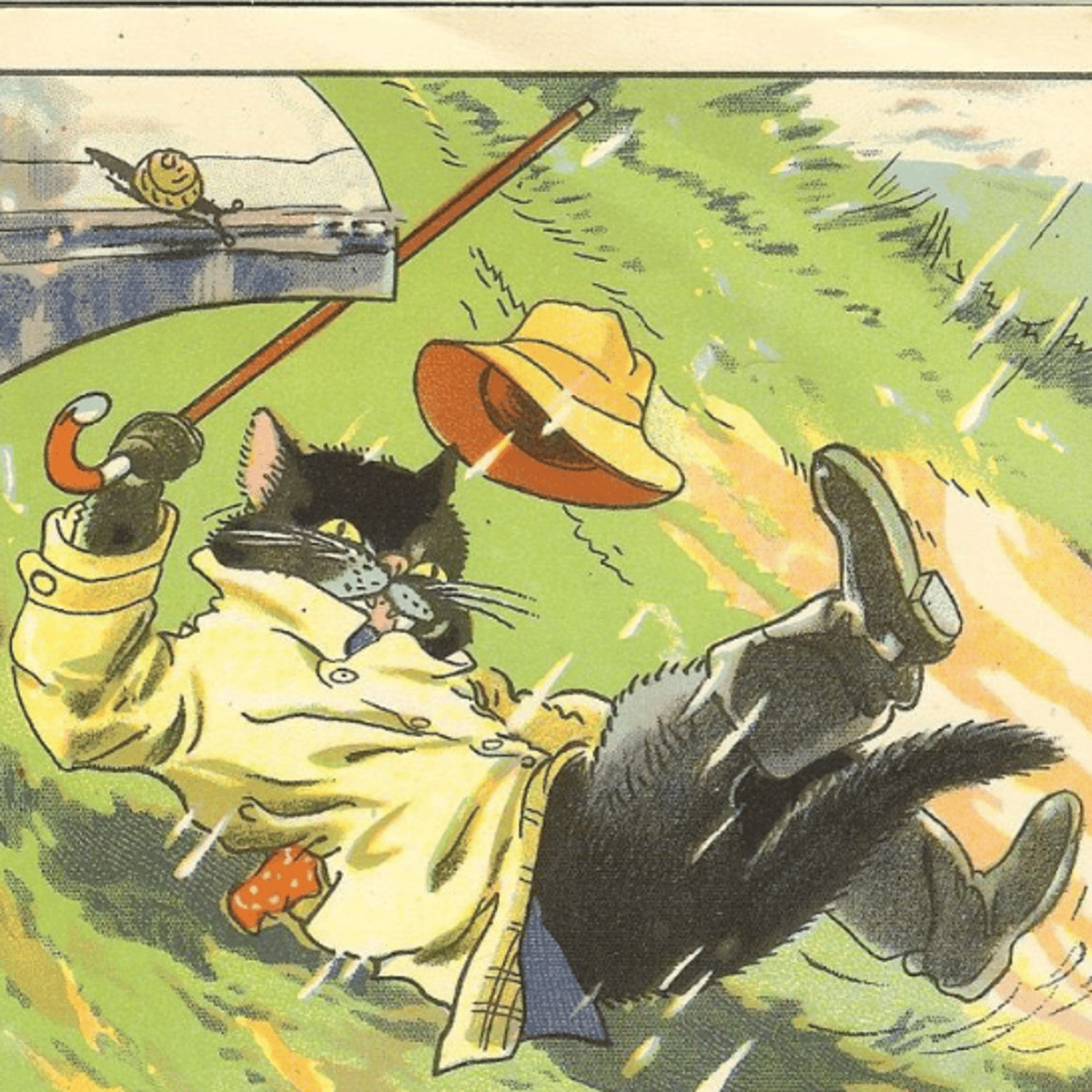 Mr black cat is a 1940 anthropomorphic father cat he wears raincoat hat and black rubber boots and holds his black umbrella when it rains