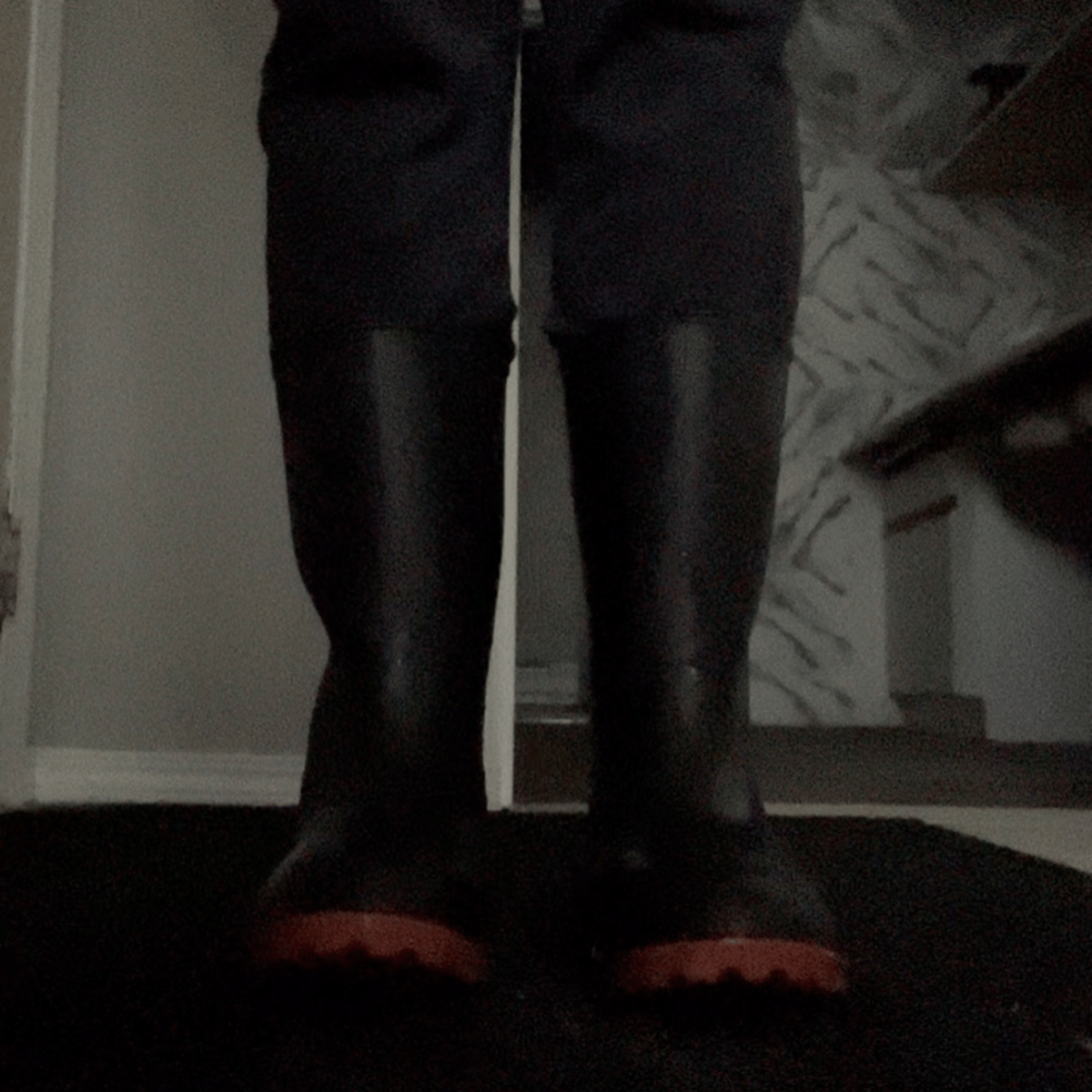 I wearing my black rubber boots with red soles in muddy puddles