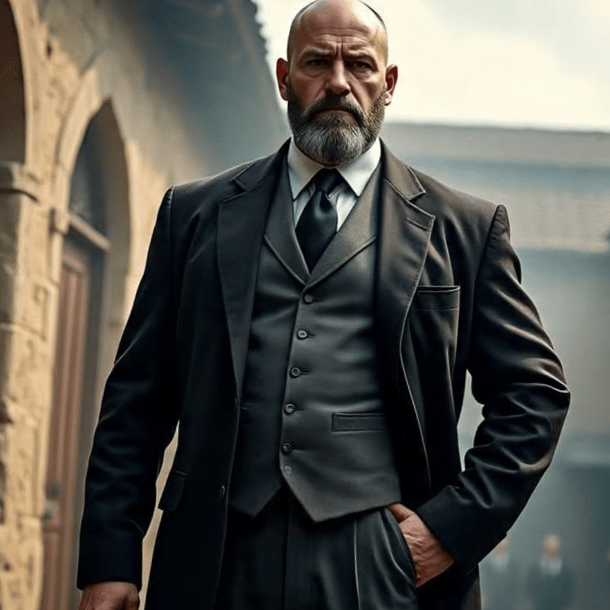 The headmaster towers over the room, a massive, muscular figure exuding authority. His rugged good looks—sharp jawline, piercing eyes, and a stern expression—command respect. Broad shoulders and a barrel-like chest strain against his crisp suit, while powerfu