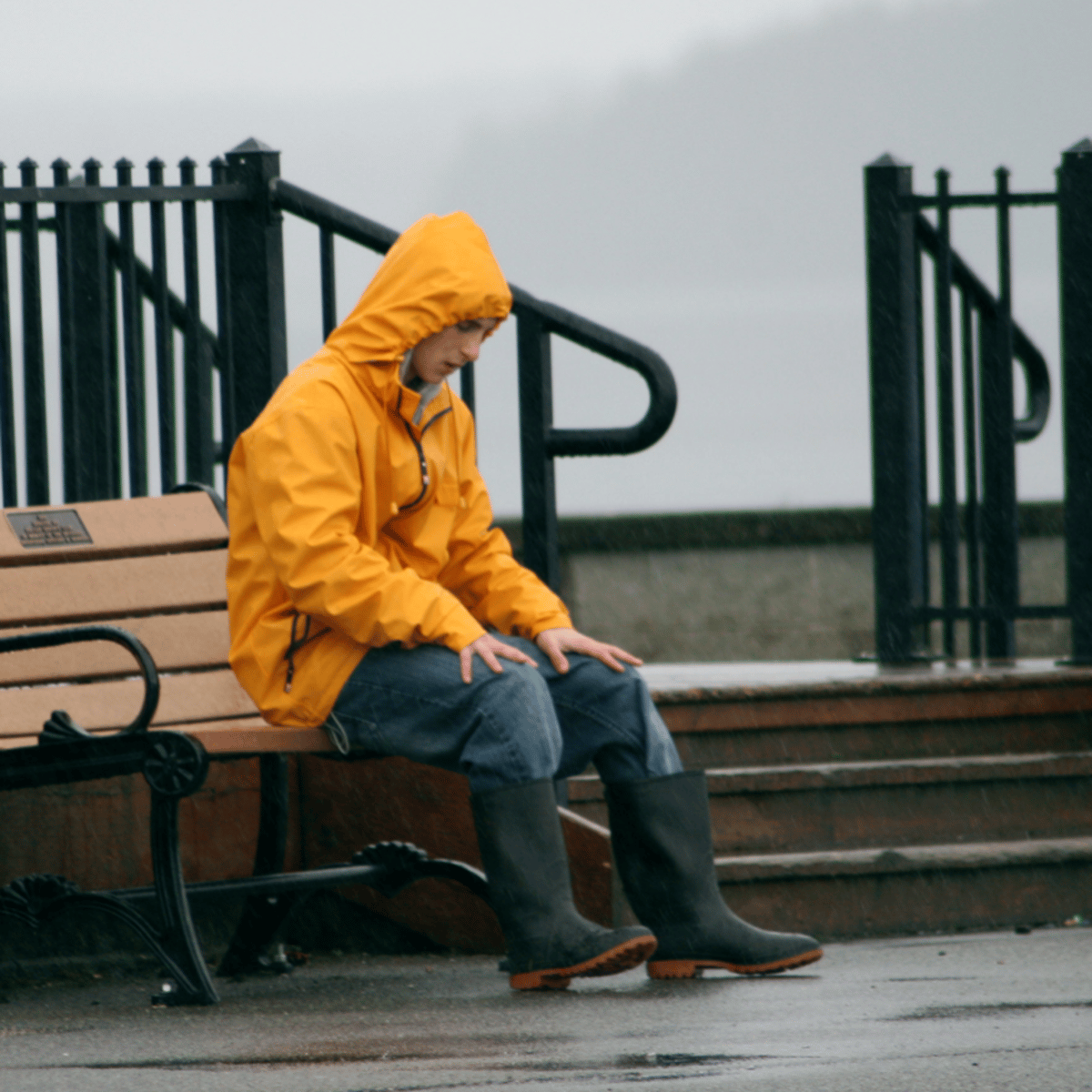 This guy looked kind of sad just sitting in the rain by himself. Wearing his yellow raincoat blue jeans and black rubber boots with red soles