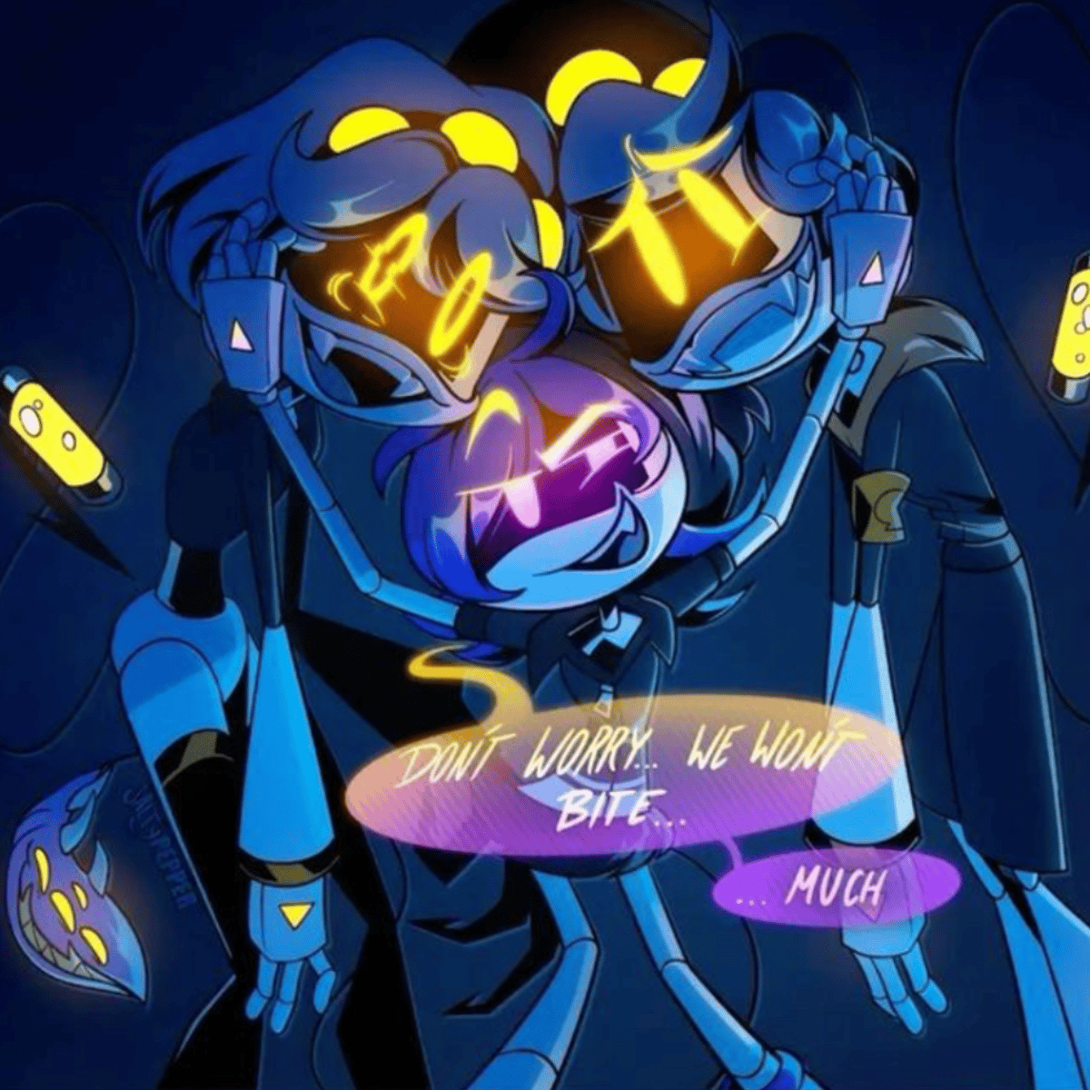 V is a complete psycho she standing in right besides Uzi While N is not a psycho and he is standing besides Uzi Uzi is an angsty little drone that is smaller than both of them