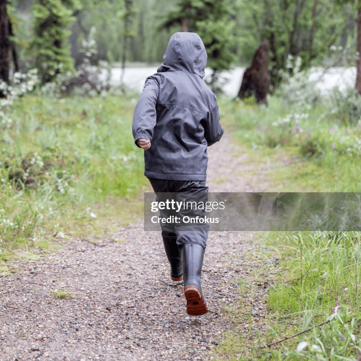 Boy in jeans and black rubber boots with red soles