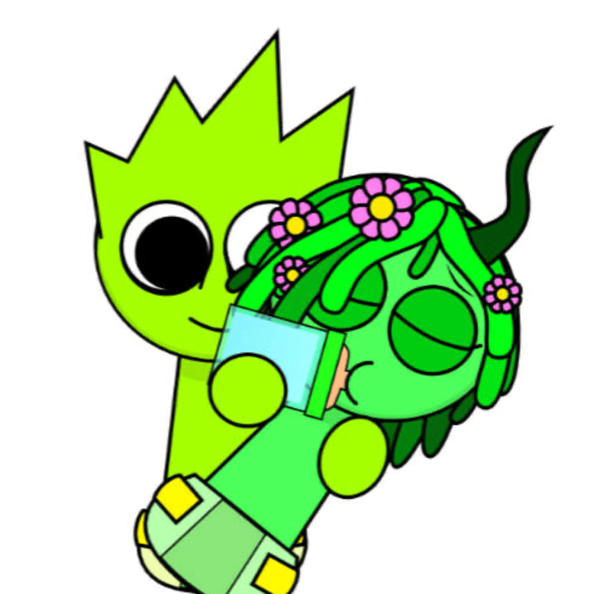 *Vineria is a green Sprunki with a dark green horn and wears flowering vines with 4 flowers on her head as a wig and OWACKX is a lime Sprunki characterized by a frazzled expression. His pupils are mismatched, with the right pupil being larger than the left. He has five tufts of hair on his head.