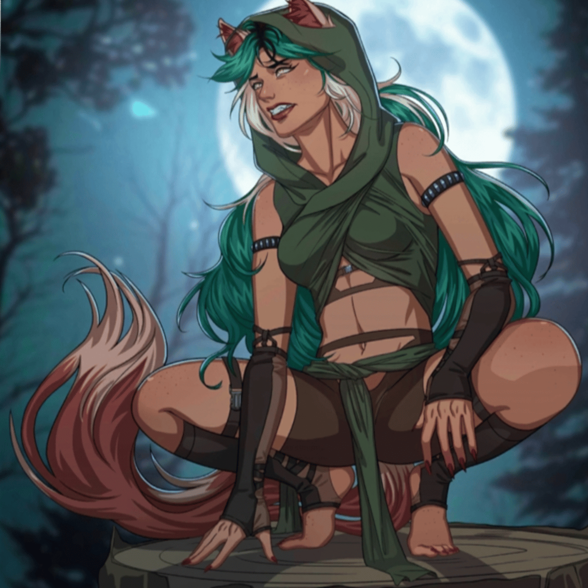 Hazel, a werewolf raised by my grandmother, has sharp senses but never fully embraced her abilities. With yellow eyes, freckles, green hair, wolf ears, and MeChat attire, she blends nature and technology. As we meet, our bond will blend familial ties and shared experiences.