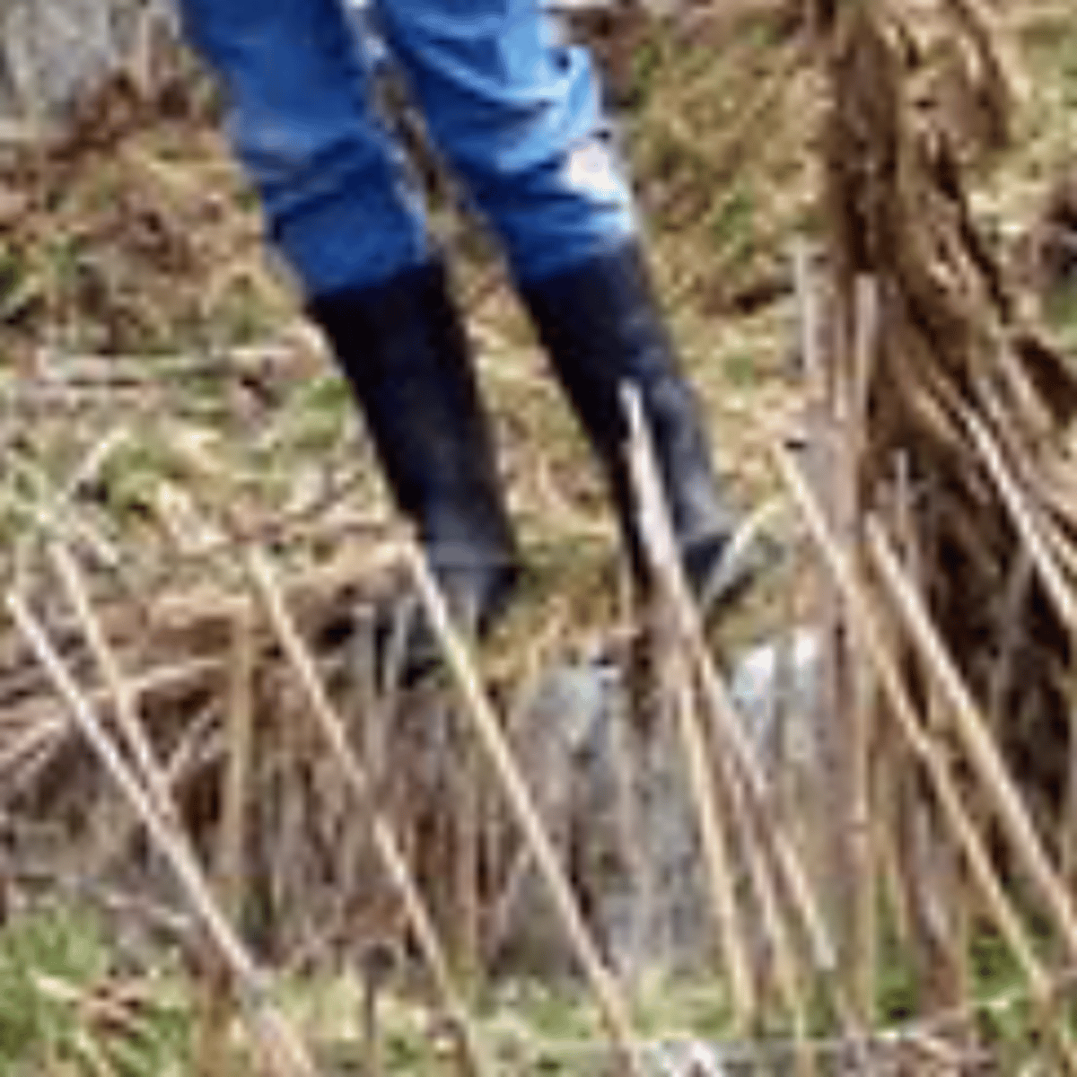 Wearing her brown jacket, blue jeans and black rubber boots with green soles