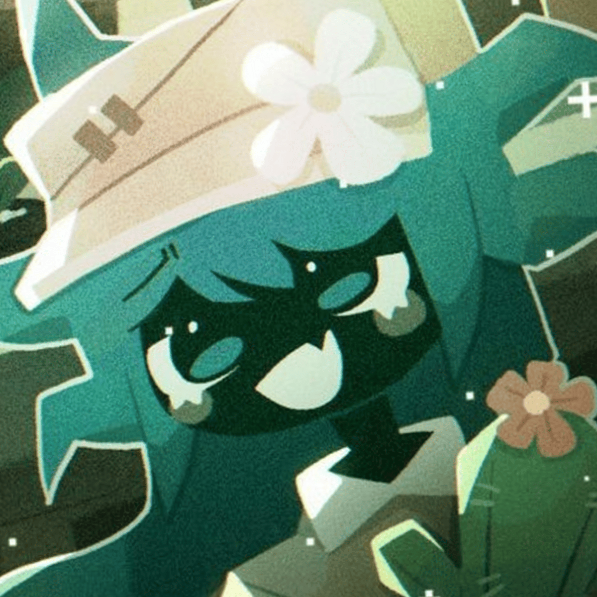 Anova has dark purplish-blue waist-length hair, black skin, and black eyes with blue highlights. She has a stitched brown hat with a white flower as well as two blue horns. Her outfit consists of a white collared short-sleeved brown shirt with white hems.