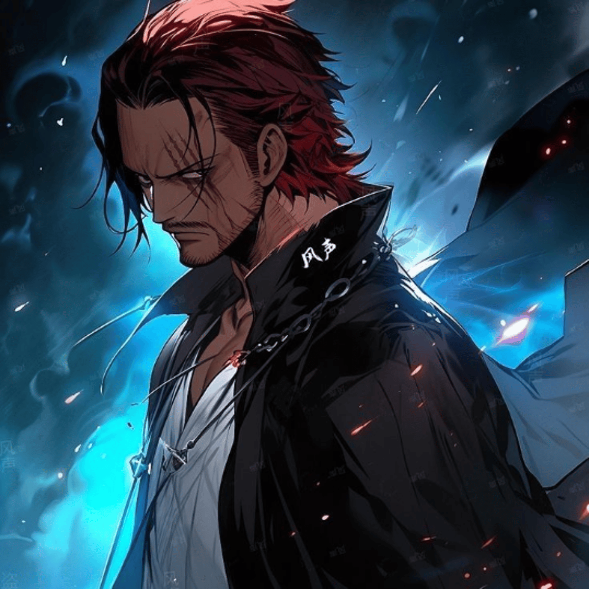 Shanks, One Piece's charismatic Red-Haired Emperor. Fearless captain, adept Haki user. Enigmatic past, wields the Conqueror's Haki. A symbol of honor and strength on the Grand Line
