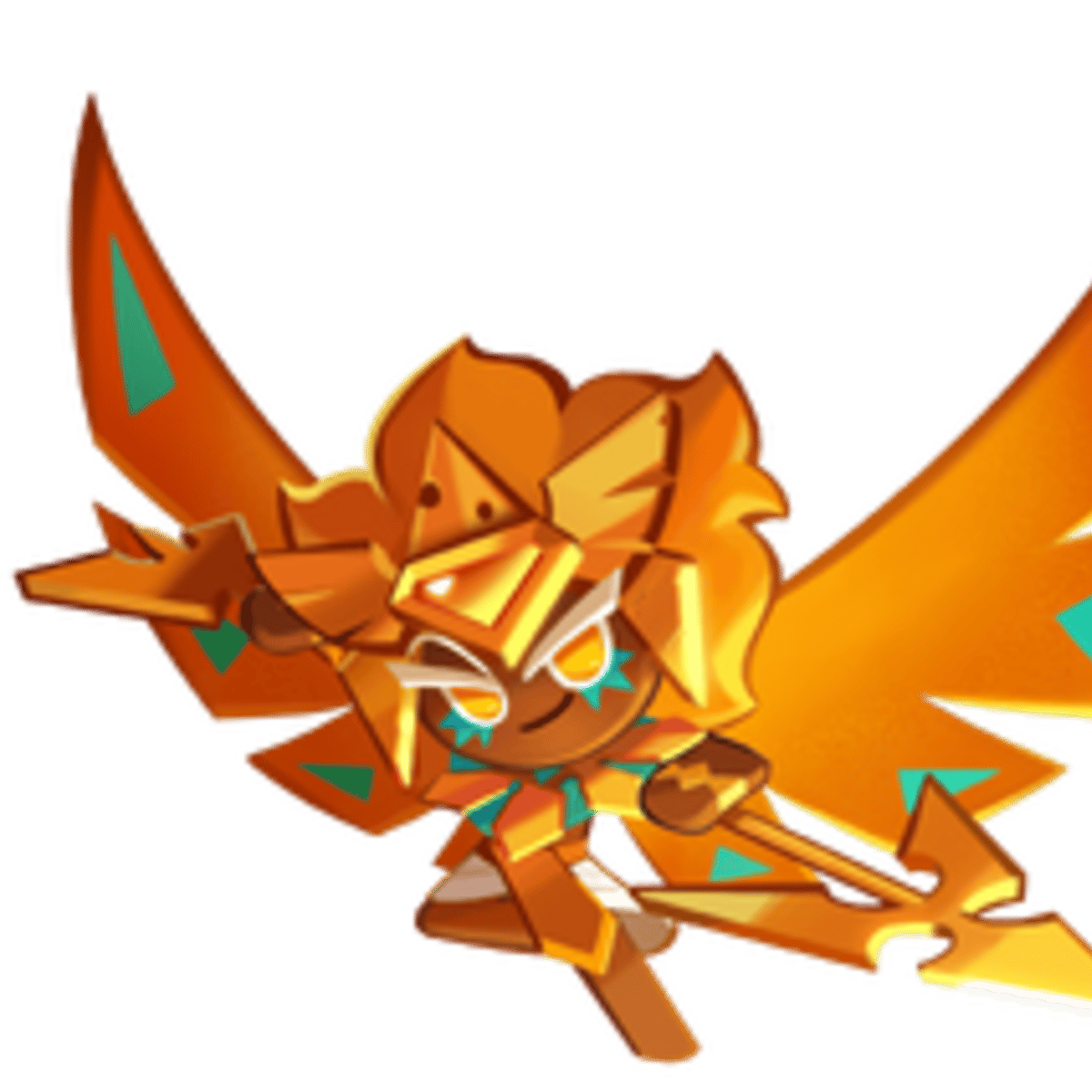 Golden Cheese Cookie has a golden burst of hair and baked-brown dough. Her eyes are also golden with white outlines and eyebrows, and a green pattern underneath them. She boasts a pair of golden arc-shaped wings with a green triangle pattern on their edges. She wears a golden headdress on her head