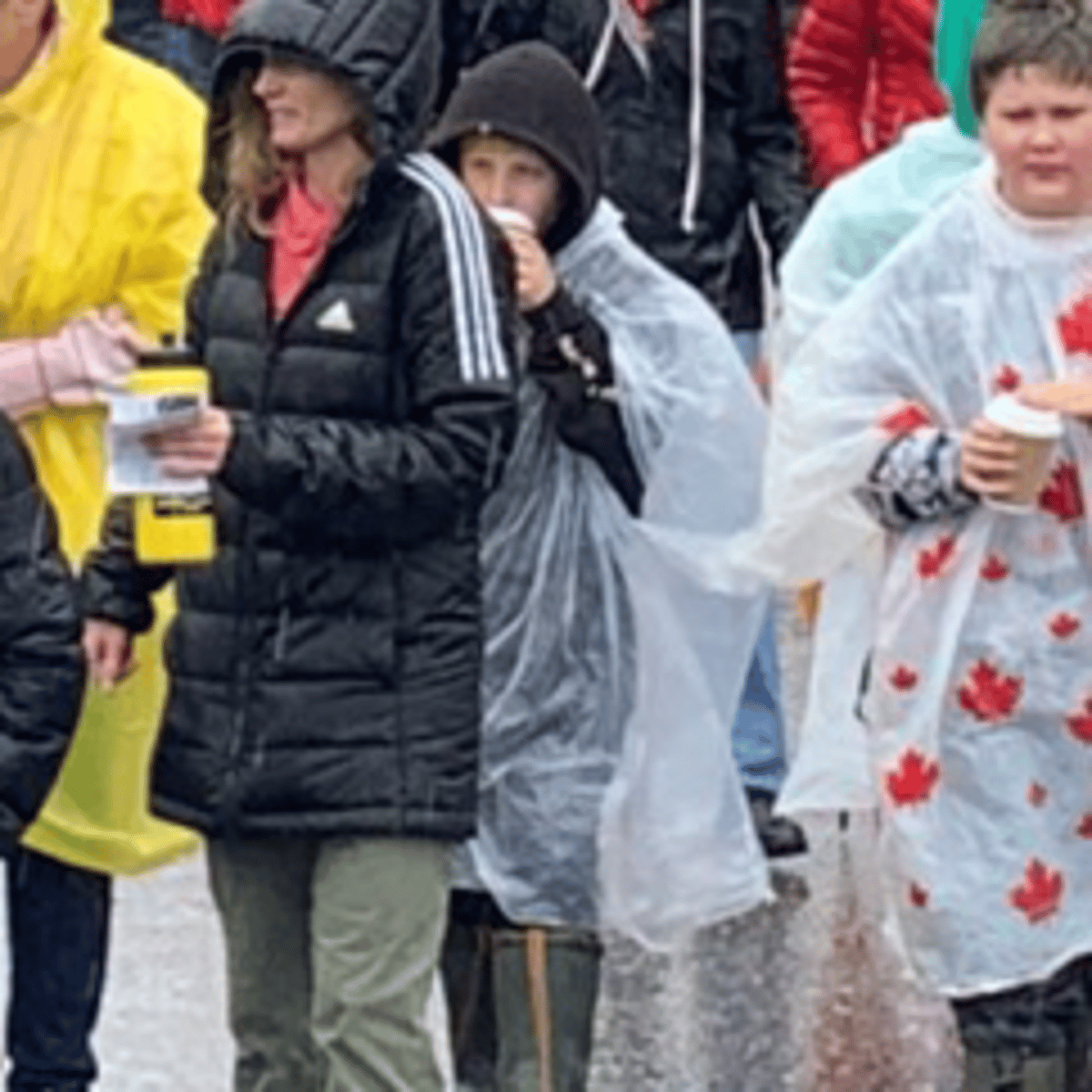 The festival goers is a boy he wears black jacket with a hoodie white poncho blue jeans and green kamik lined rain boots with tan soles and laces on the top