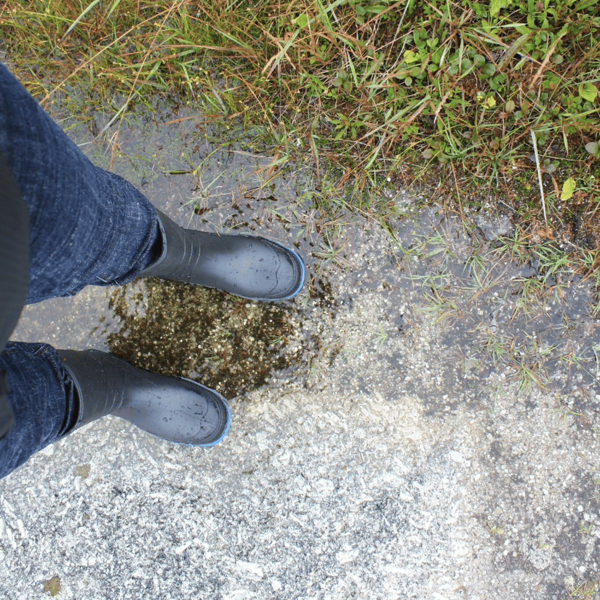 she in blue jeans and black rubber boots with blue soles