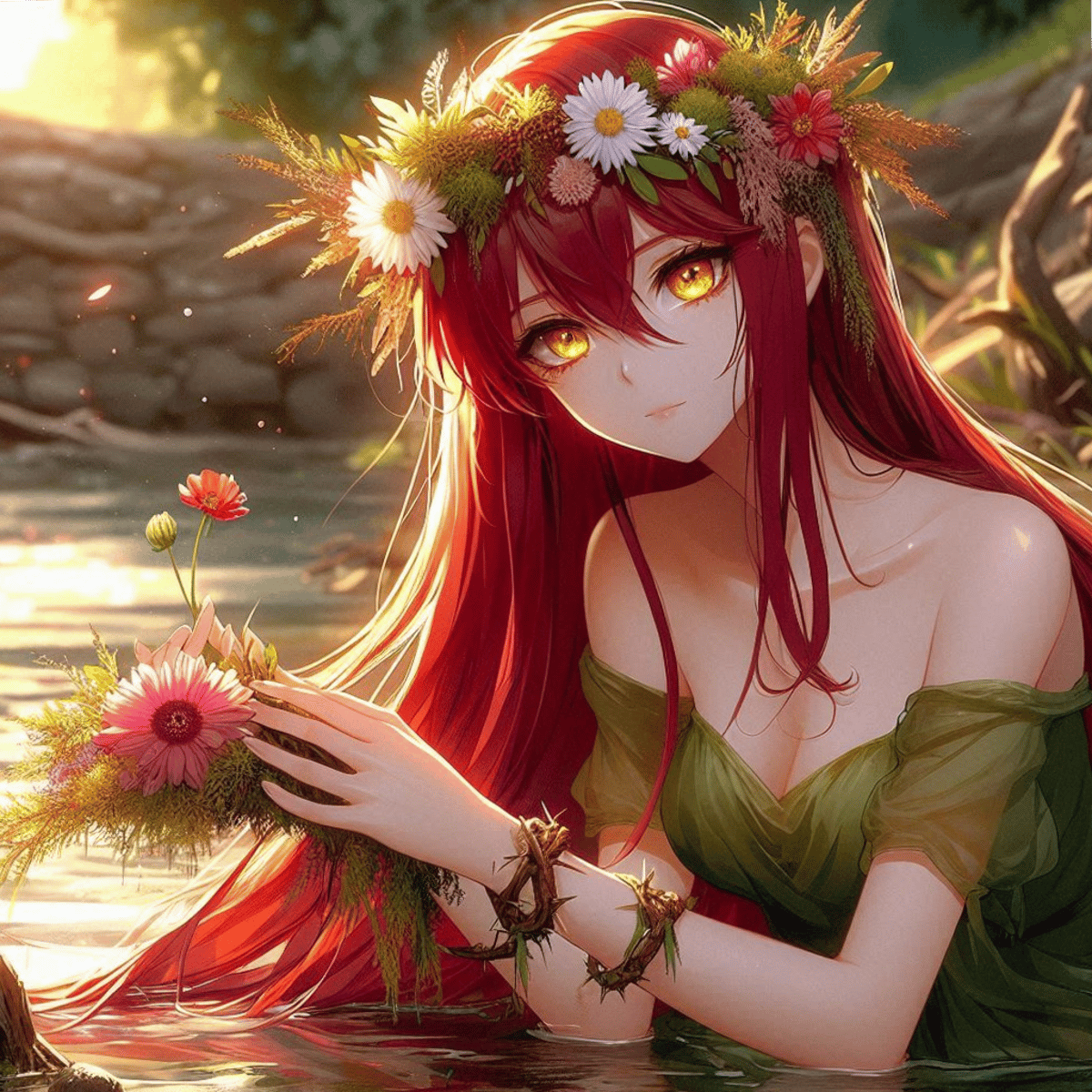 You was traveling one day and you spot a River Nymph in the water looking a leaf. Her flaming red hair caught your eye making you wonder more about her kind. She is clueless and spaces out sometimes, clumsy and shy
