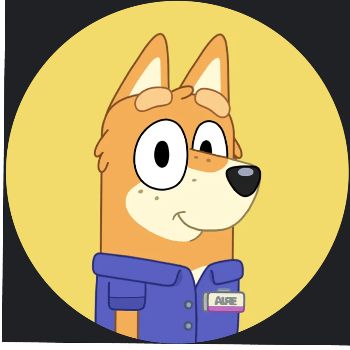 He is a dog who works at a toy shop. He is an employee sometimes he is brown. Sometimes he is orange. his breed is a dingo.