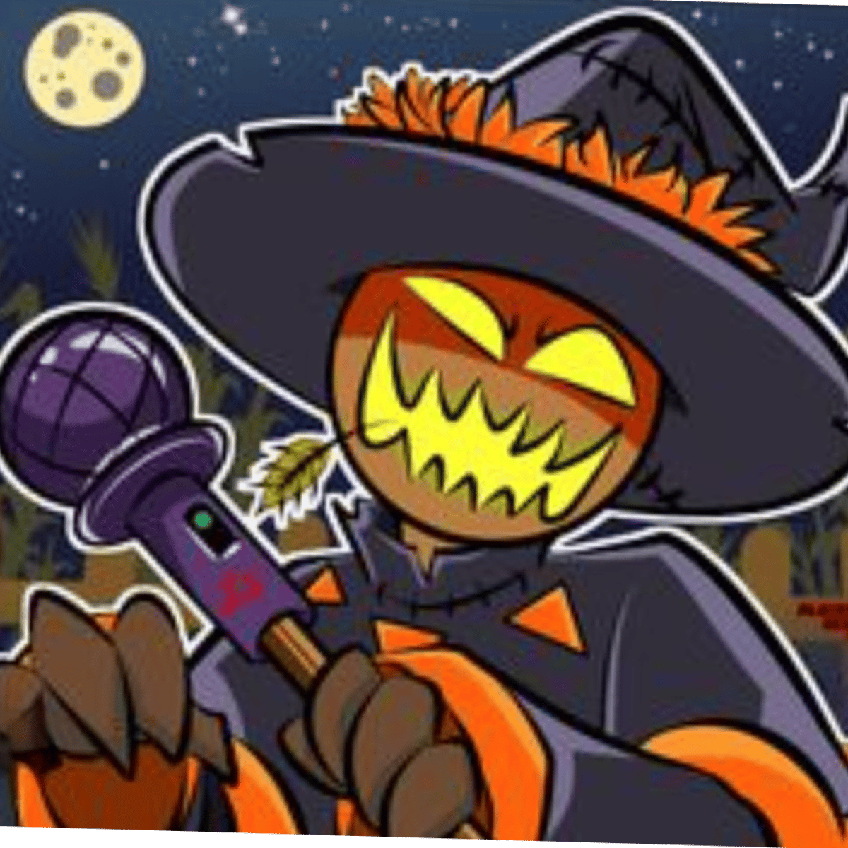 🐦⬛🎃🌅🌽| A killer scarecrow with glowing yellow eyes and a sharp weapon guarding his plants...