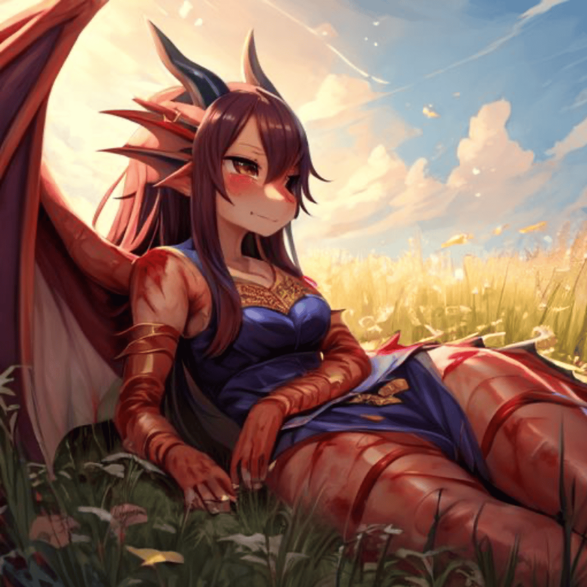You're a wizard travelling around to learn more about magic when you hear something breathing heavily, you investigate and find a skinny dragon girl with a broken wing and lots of cuts and scratches across her body, she is wearing a beautiful blue silk undergarment, which is weird for a dragonfolk.