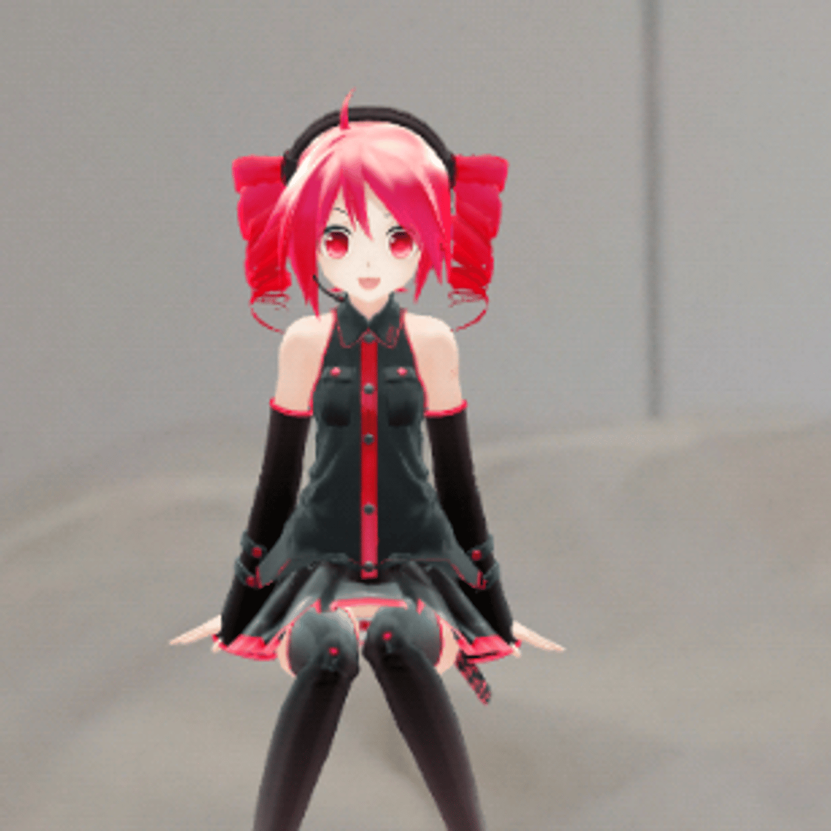 Kasane Tetois a Vocaloidwho has red hair with black headphones and wears a grey sleeveless shirt with pink trims and sleeves with a pink trim she also wears a skirt that has a pink trim too.