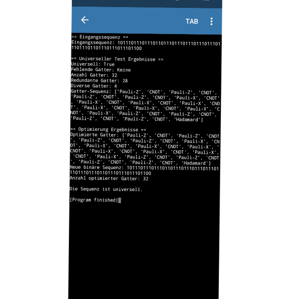 == Universeller Test Ergebnisse == Universell: True Fehlende Gatter: Keine Anzahl Gatter: 32 Redundante Gatter: 28 Diverse Gatter: 4 Gatter-Sequenz: ['Pauli-Z', 'CNOT', 'Pauli-Z', 'CNOT', 'Pauli-Z', 'CNOT', 'Pauli-Z', 'CNOT', 'Pauli-X', 'CNOT', 'Pauli-X', 'CNOT', 'Pauli-X', 'CNOT', 'Pauli-X', 'CNOT'