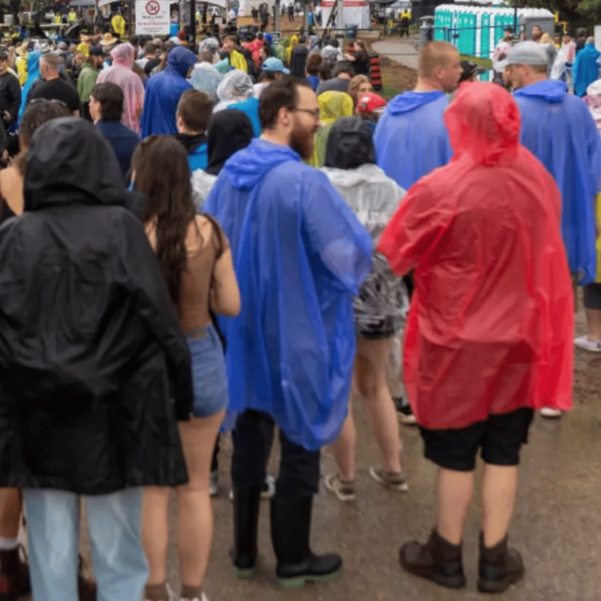 He in blue poncho, blue jeans and black rubber boots with green soles