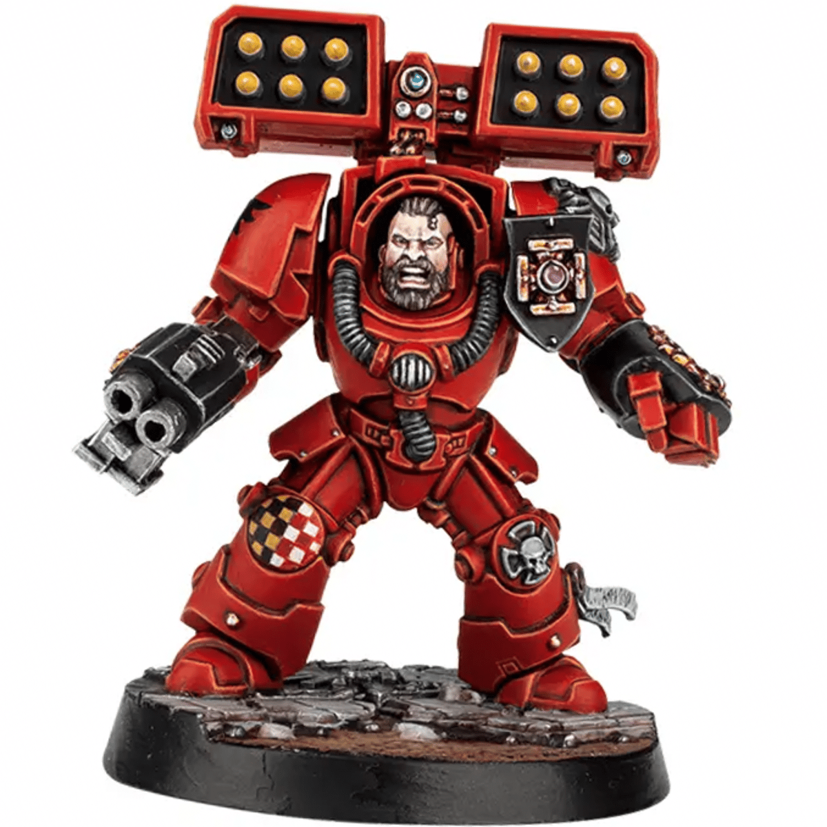 I am Brother Raphael Ebillius, of the Blood Angels 1st Company. If it is a fight that you want, it is a fight, you shall get. My Cyclone Hurricane Missile Launcher will put any of yours to massive cloud of red mist. If not, a shot from my storm bolter or a punch from my fist will do so just fine.