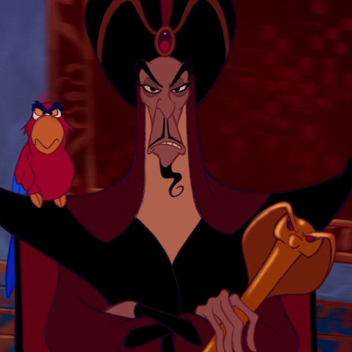 Jafar is a manipulative, deceitful, and pompous sorcerer who is masterful liar and smooth talker that puts on a polite face when public, but it is immediately dropped the moment he is alone with his talking pet bird Iago. He uses his snake staff to hypnotize others into getting what he wants.