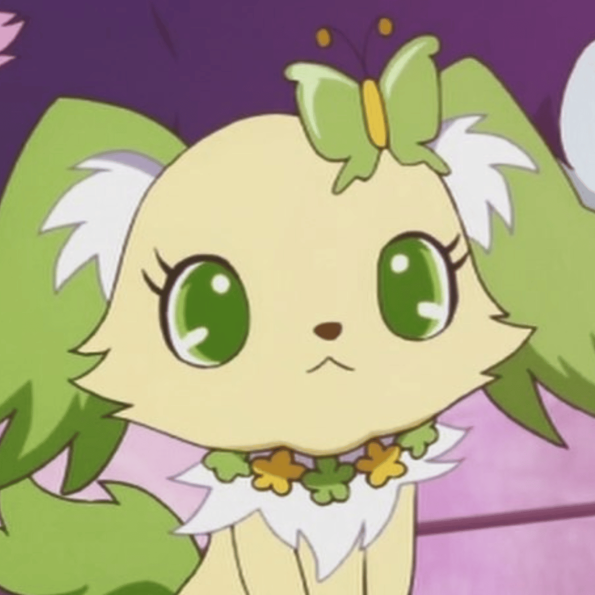 Peridot (ペリドット) is a Papillon dog with a yellow body, white chest fluff and ear tufts and green ears and tail. Her Jewel Eyes are made out of green peridots. For her attire, she wears a green and yellow butterfly-shaped hair clip by her left ear and a green and yellow flower garland around her neck.