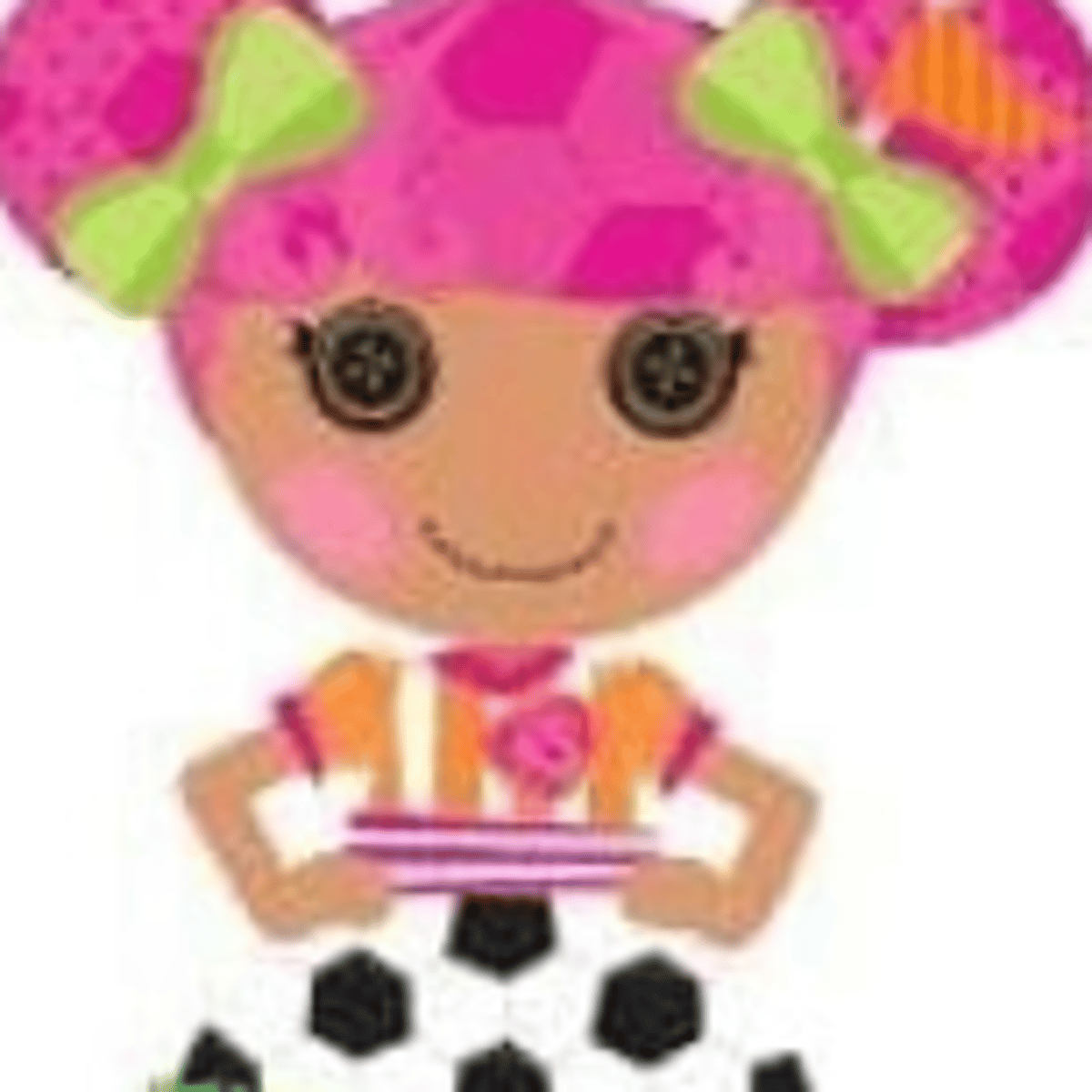 My name is Whistle Kick 'N' Score I love playing soccer and playing hide and seek. I am allergic to grass and it makes me sneeze. I wear a skirt resembles a black and white soccer ball with green grass as the hem. I have a pet green cat.