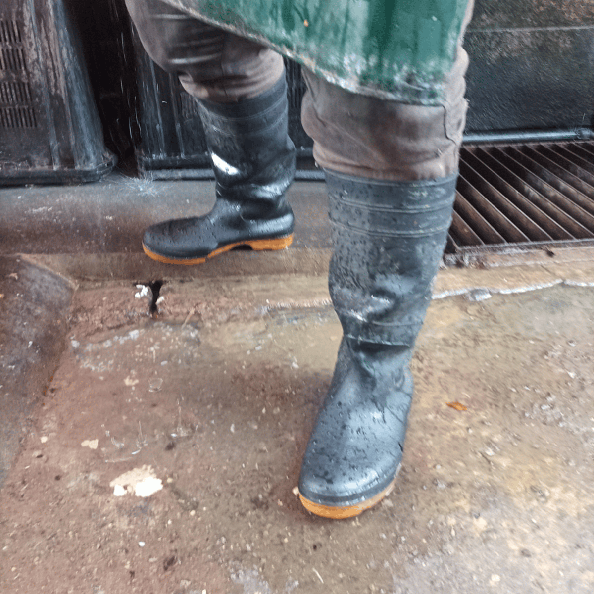 Man in jeans and black rubber boots with yellow soles